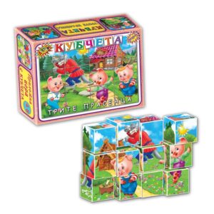 Комплектът кубчета Трите прасенца съдържа 12 броя кубчета с размери 4 x 4 cm. Те дават възможност да се подреждат шест картинки по мотиви от