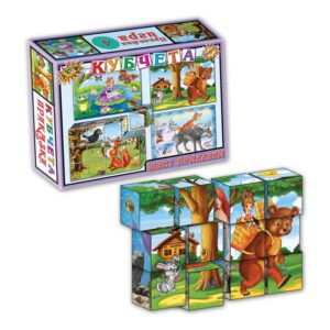 Комплектът кубчета с цифри съдържа 12 броя кубчета с размери 4 x 4 cm. На тях има изобразени различни приказки. С подреждането на картинките