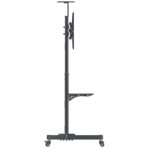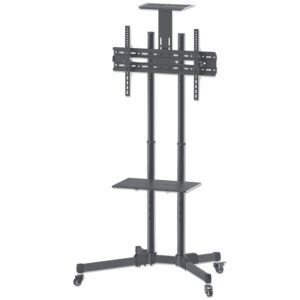 Стойка за под за телевизори от 37 „до 70“. Наклон +/- 10 °. Възможност за монтиране на камера. Подвижен рафт. Цвят: черен.
