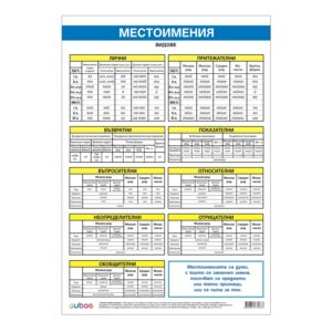 Ученическото табло съдържа важна информация за местоимението, неговите видове и правописни правила. Таблото е двустранно ламинирано, с