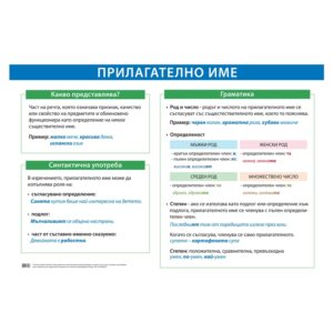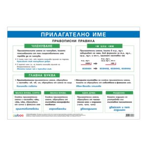 Двойноламинирано табло. Размер: 100 x 70 cm. Съдържа важна информация за прилагателните имена, техните видове и правописни правила.