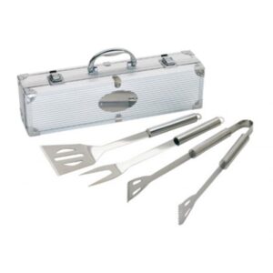 Комплектът за барбекю от неръждаема стомана включва лопата за скара, вилица и щипки в стоманено куфарче с дръжка. Цвят: сребрист. Материал: