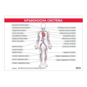 Двойноламинирано табло. Размер: 70 x 100 cm. Таблото съдържа информация за: устройството на сърцето, кръвообращение, състав на кръвта, строеж на