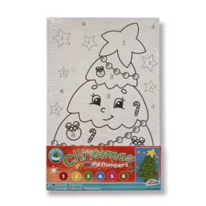Платно за оцветяване по номера „Елха“. Опаковката включва платно, 12 цветни бои и 3 четки за рисуване. Размери: 29.7 х 19.5 cm. Подходящо за деца