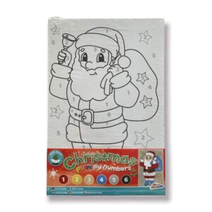 Платно за оцветяване по номера „Дядо Коледа“. Опаковката включва платно, 12 цветни бои и 3 четки за рисуване. Размери: 29.7 х 19.5 cm. Подходящо за