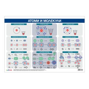 Двойноламинирано табло. Размер: 70 x 100 cm. Атомите, молекулите и йоните са градивни частици на веществата. Атомът има ядро и обвивка. В ядрото