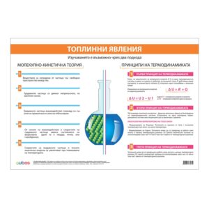 Двойноламинирано табло. Размер: 70 x 100 cm. Таблото разглежда двата подхода за изучаване на Топлинните явления. Статистическият подход се