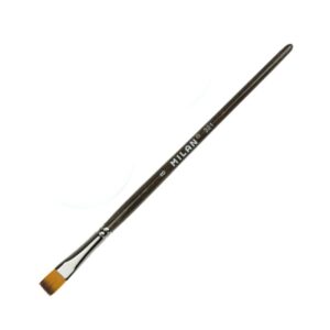 Плоска четка за рисуване с дървена дръжка. Корпус с лаково покритие в цвят орех и никелирана ферула. Синтетична четина с влакна с диаметър