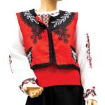 Елек с апликация за народна носия, подходящ за деца до 16-годишна възраст. Цвят: червен. Изработен от 100% полиестер.