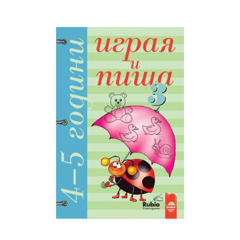 „Играя и пиша“ е поредица от 13 книжки, която помага на детето да развие своите интелектуални способности и да тренира фината моторика на ръката. Простотата на рисунките, разнообразието от упражнения и цветовото оформление на кориците стимулират детето и правят работата му по-приятна. Поредицата е предназначена е деца от три възрастови групи: книжки 1–4 за 4–5 години, книжки 1–4 за 5–6 години и книжки 1–5 за 6–7 години.Играя и пиша. Книжка 3 за 4–5 години. Детето очертава картинките по прекъснатата линия и оцветява според инструкциите на всяка страница, учи се да сравнява и групира. Така то постига лекотата, толкова необходима, за да се научи да пише с ясен и красив почерк.