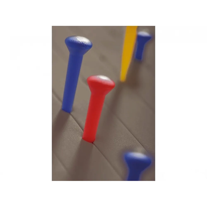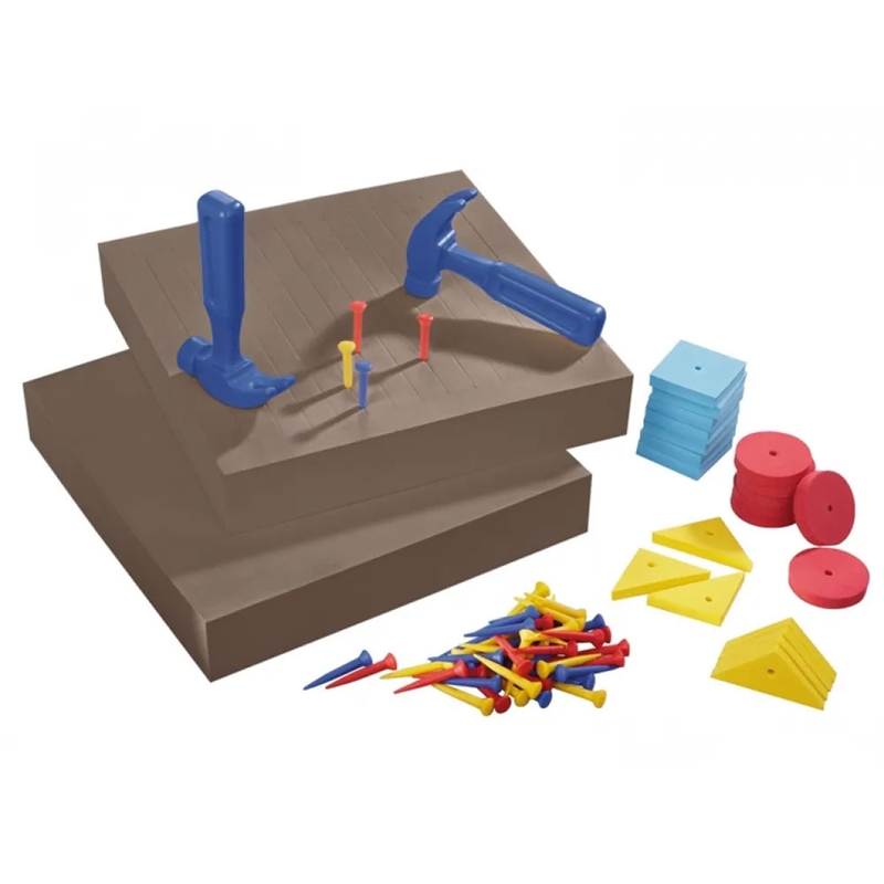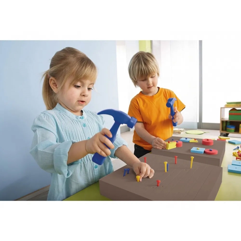 Образователна немска игра за сглобяване и съединяване, която е безопасна за употреба от деца. Развиваща образователна играчка, която насърчава фината моторика, вниманието, зрително-моторна координация и разпознаване на цветове и форми. Благодарение на мекия материал от пяна, децата се учат да забиват пирони с чук без наранявания. Цветните пластмасови пирони могат лесно да се заковат в подложката от пяна и отново да се извадят. С пироните и формите децата могат да направят фигури и модели чрез заковаване. Когато някой гвоздей падне, той никога не застава с върха нагоре, а поляга настрани, за да не го настъпи някое дете по погрешка и да се нарани. Съдържание:   – 1 основа от пяна с прорези (28 х 28 cm) за лесно забиване на пироните;   – 1 основа от пяна без прорези;   – 50 цветни пиронa;   – 2 пластмасови чука;   – 21 форми от пяна в различни цветове (кръг, правоъгълник, триъгълник).