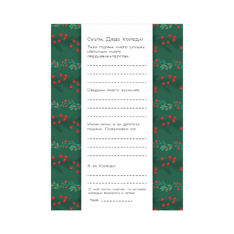 Ако желаете да брандираме този продукт за вас, моля, пишете на имейл [email protected] или се обадете на 0700 10 700. Писмо до Дядо Коледа с плик. Размер: А5; 14.8 x 21 cm. Материал: картон.