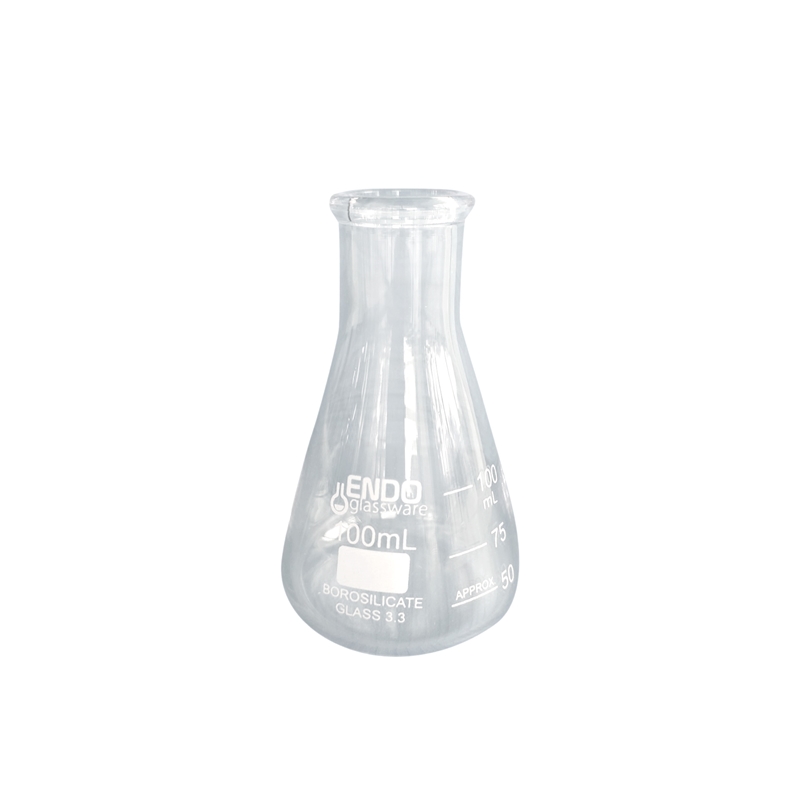 Колба Ерленмайер с тясно гърло. Обем 100 ml. Диаметър на отвора: 22 mm. Диаметър на дъното: 64 mm. Височина: 105 mm. Материал: стъкло.