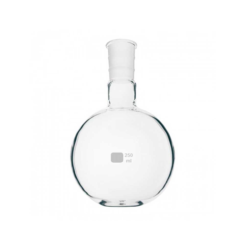 Облодънна колба, подходяща за лабораторни изследвания. С гладко дъно, което позволява да стои сама. Разполага с шлиф. Размери: 85 х 140 mm. Обем: 250 ml.
