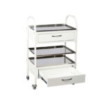 Корпусът на количката е произведен от профилни тръби с квадратно сечение 20 х 20 х 1.5 mm. С прахово покритие, удобно за почистване. Три рафта, с максимално натоварване на рафт: 10 kg. Рафтовете са от неръждаема стомана с дебелина 0.8 mm. Повърхността на рафтовете е устойчива на удари, надрасквания и на химикали и дезинфектанти, които се използват в обичайната медицинска практика. Две чекмеджета с максимално натоварване: 15 kg. Медицинската количка има четири колела, две от тях със спирачен механизъм. Размери: 960 х 600 х 430 mm. Тегло: 26 kg. Гаранционен срок: 2 години.