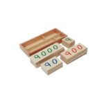 Дървените плочки с числа е Монтесори материал, който се състои от дървена кутийка, в която са подредени 36 дървени плочки с различна големина. – девет плочки с числата от 1 до 9 с големина 4.5х 4.5 cm; – девет плочки с числата от 10 до 90 с големина 9х4.5 cm; – девет плочки с числата от 100 до 900 с големина 13.5х4.5 cm; – девет плочки с числата от 1000 до 9000 с големина 18 х 4.5 cm. Целта на заниманията с дървените плочки с числа детето да се запознае с числата, образуването на двуцифрени, трицифрени и четирицифрени числа и техния числов разред. Също така е и подготовка за алгебра и смятане на многоцифрени числа. Размери: 25.5 х 10.5 х 6cm, тегло: 500 g. Подходящо за деца над 3.5 години. Преди заниманията с дървените плочки с числа е препоръчително детето да се запознае с Дървени вретена и дървени цифри и жетони.