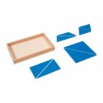 5 дървени кутии с различни форми, съдържащи различни по цвят и форма триъгълници. Този Монтесори материал е подходящ за развиване на знанията по планетарна геометрия у децата. Триъгълните елементи от всяка кутия формират праволинейни или правоъгълни форми. Наричат се „конструктивни“, защото запознават детето с концепцията за визуални образи, които могат да се комбинират за да образуват различни форми. Комплектът съдържа: – 2 правоъгълни кутии; – триъгълна кутия; – 2 шестоъгълни кутии. Размер на кутията: 25х25х10 cm. Тегло: 2 kg. Подходящо за деца над 3 години.