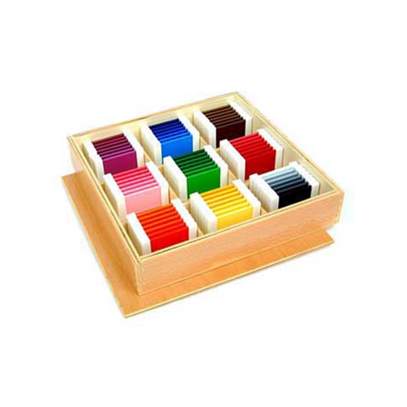 Целта на работата с цветните плочки е да се различава различната интензивност на цветовете. Освен това децата се научават да подреждат и класифицират различни предмети по определен признак ( в случая цвят). Продуктът се състои от дървена кутия с капак, в която има 63 дървени плочки с различен цвят. Плочките са разделени на 9 групи. Всяка група е със седем различни нюанса на определен цвят. Заниманията с този продукт са подходящи за деца над 4 години.