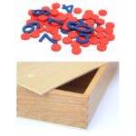 Монтесори материал, който е изработен от дърво. Състои се от дървена кутийка с капак, в която се съдържат числата от 0 до 9 и 45 чипа. Чиповете съответстват на сумата на числата от дървената кутийка. Целта на заниманията с този Монтесори материал е децата да се запознаят с количественото измерение на всяка цифра, а именно – колко отделни единици се съдържат в нея. Освен това децата по-лесно научават реда на цифрите и също така да ги разделят на четни и нечетни. Работата с този продукт помага на децата по-лесно да се справят с делението на числа в училище. Размери на кутията: 22 х 10.5 х 5 cm, тегло: 0,5 kg. Подходящо за деца над 4 години. Препоръчително е преди заниманията с Кутията с цифри и жетони, детето да се запознае с кутията с вретената. Внимание: Продуктът съдържа малки елементи, които могат да бъдат погълнати!