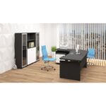 Мебелите са изработени от ПДЧ с меламиново покритие. Плотът, краката на бюрото и таванът на контейнера са с дебелина 36 mm и кант на плотовете 2 mm. Стелажите са с плоскости и гръб 18 mm, ПДЧ. Стъклените врати са с алуминиева рамка. Възможностите за избор на цветове разгледайте от тук.