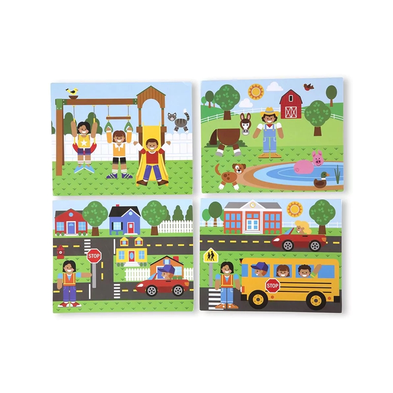 Комбинирайте повече от 100 дървени магнита, за да пресъздадете и оживите различни сцени! Поставете голяма фонова сцена на магнитната дъска