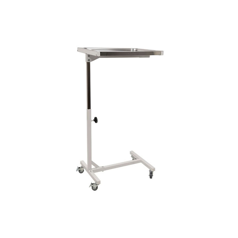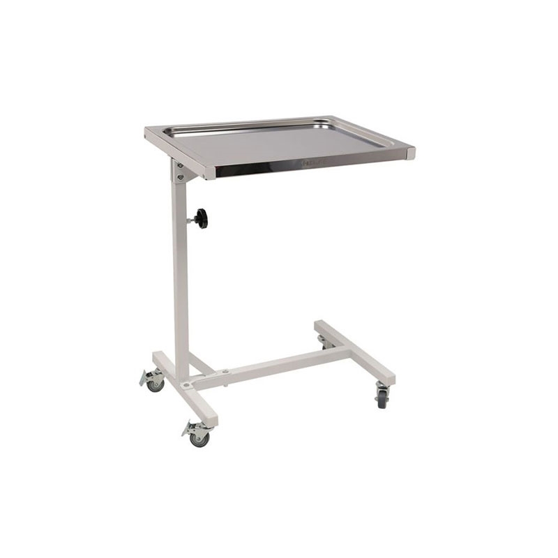 Хирургичната масичка е предназначена за инструменти, приспособления и друг медицински инвентар, използван при провеждане на лечебни процедури, хирургични операции в клиники, болници, лаборатории и други. Стойката на масата е изработена от квадратен стоманен профил: 30 х 30 х 1.5 mm, с прахово полимерно покритие. Плотът е изработен от неръждаема щампована стомана, без остри ръбове и с борд, който не позволява падане на инструментите при придвижване на масичката. Максимално натоварване на рафта: 15 kg. Височината на плота се регулира с помощта на пластмасова дръжка. Минимална височина на плота: 755 mm. Максимална височина на плота: 1055 mm. Повърхността на плота е устойчива на удари, надраскване, дезинфекционни материали. Масата е оборудвана с четири колелца от 50 mm, изработени от немаркиращ материал, който не оставя следи по настилката. Размери: 755-1055 х 420 х 435 х 560 mm. Цвят: бял. Тегло: 9.4 kg. Доставя се в разглобен вид. Гаранционен срок: 2 години.