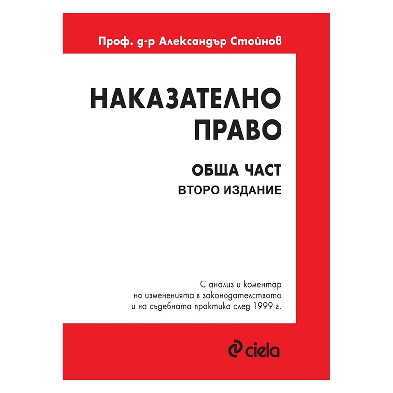 Настоящото издание представлява актуализиран и допълнен вариант на вече утвърдения учебен курс по наказателно право обща част. В новото издание са разгледани задълбочено всички институти от Общата част на Наказателния кодекс. Освен това са анализирани и коментирани тенденциите в съдебната практика и тълкувателните решения на Върховния касационен съд. Проф. д-р Александър Стойнов е роден на 8 юни 1949 г. в гр. София. Завършва средно образование през 1968 г. в лицей „Декарт“ при Френската културна мисия – гр. Алжир и висше образование през 1974 г. в ЮФ на СУ „Св. Климент Охридски“. Започва преподавателска дейност в СУ „Св. Климент Охридски“ като асистент по наказателно право през 1977 г., а през 2004 г. получава званието професор. Доктор по право е в същия университет. Специализирал е в Париж, в Института за сравнителноправни изследвания и в Юридическия факултет на Сорбоната по въпросите, свързани с жертвата на престъплението. Наред с това е специализирал и в областта на основните права на човека в Юридическия факултет на Университета в Монпелие, Франция. Носител на почетен знак на СУ „Св. Климент Охридски“ с огърлица. Проф. д-р Александър Стойнов е автор на множество монографии, учебници (включително и на брайлови издания), статии и студии на български, руски, френски и немски език. Десетки статии и студии по широк кръг въпроси на наказателното право, включително по проблемите на защита на банковата тайна, за жертвата на престъплението, престъпленията против личността, престъпленията против правата на гражданите, престъпленията против собствеността и т.н. Издателство: Сиела. Година на издаване: 2019. Брой страници: 608. Автор: Александър Стойнов. Вид на корицата: мека.