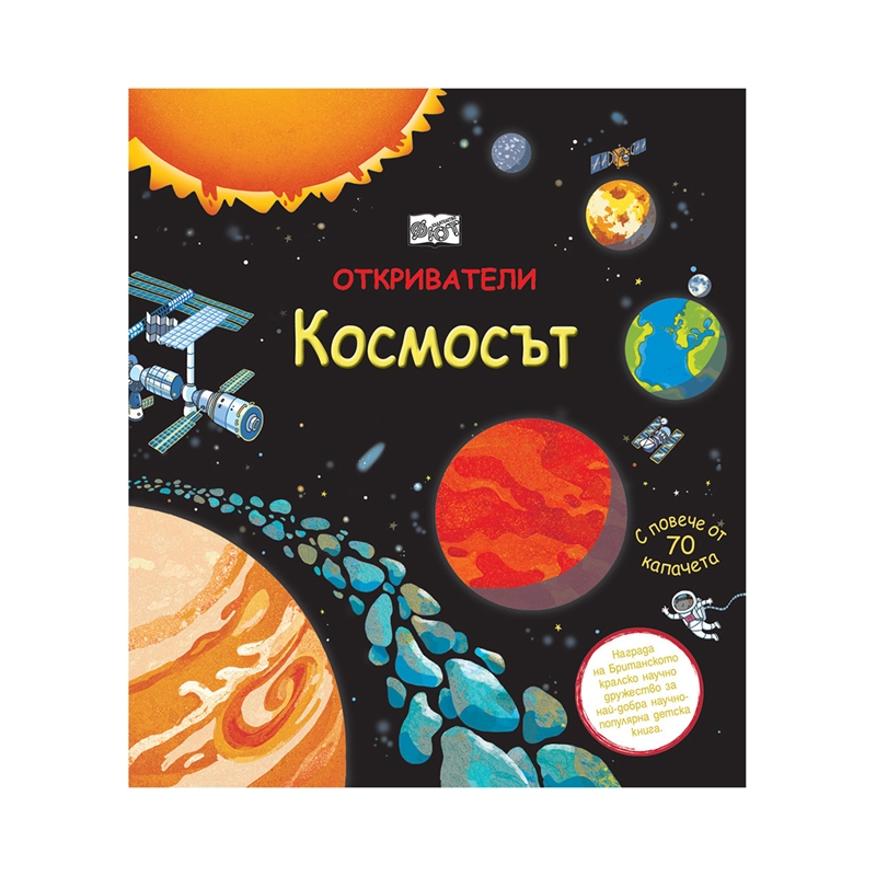 Енциклопедия с капачета от поредицата „Откриватели“ на издателство „Фют“. Повече от 100 подвижни двойни капачета, които ще ти представят много интересни факти за необятния Космос, и забавлението е гарантирано.
