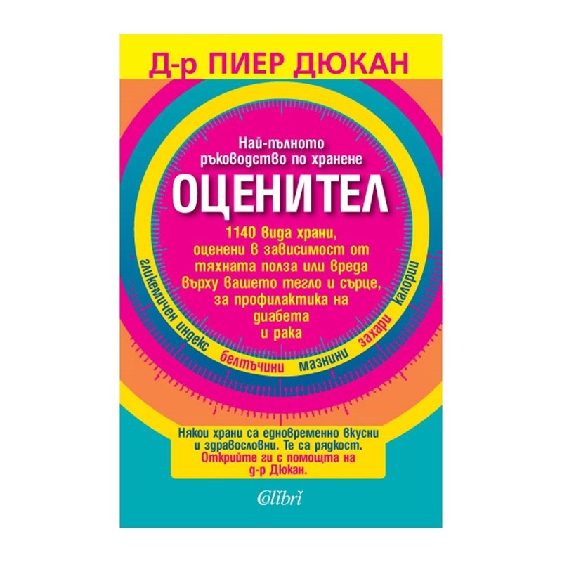 Най-пълното практическо ръководство по хранене! 1140 вида храни, оценени в зависимост от тяхната полза или вреда мърху вашето тегло и сърце, за профилактика на диабета и рака! Вие искате: • Да отслабнете или да контролирате теглото си; • Да предпазите сърцето си; • Да не заболеете от диабет; • Да се предпазите от рак… Не консумирайте нищо, без да се допитате до Оценителя! В един човешки живот има 90 000 хранения: системното повторение на една грешка или полза може да промени всичко! Доктор Пиер Дюкан е създател на режима, носещ неговото име – „режимът Дюкан”. Най-ефикасният известен досега метод да съхраните здравето и красотата си! След забележителния успех на книгите му „Как да отслабнем завинаги“ и „Моята диета в 350 рецепти“ (ИК „Колибри“), д-р Пиер Дюкан едва ли има нужда от представяне. И все пак. Ако влезете в Интернет и напишете името му, ще се отворят 52 страници, съдържащи 7 720 файла. А ако напишете името на български, ще разполагате със стотици мнения, изказани във форуми, и със стотици възторжени изявления. Д-р Пиер Дюкан е автор на десетина книги, издадени в стотици хиляди екземпляри, започва кариерата си през 1966 г. като общопрактикуващ лекар. Много скоро обаче се ориентира към диетологията и създава изключително ефикасна диета за трайно отслабване. Д-р Дюкан е първият диетолог, който използва протеинов режим – за ужас на колегите си, чиито препоръки не излизат от кръга на плодовете и зеленчуците.