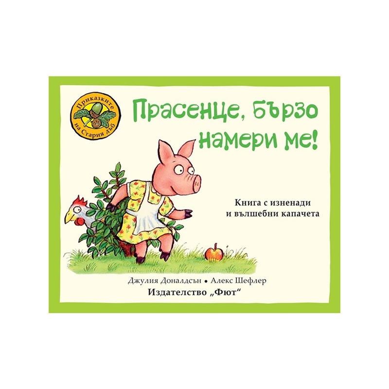 Книги с римувана весела приказка, с изненади и вълшебни капачета!Дълбоко насред старата дъбова гора прасенцето и кокошката играят на криеница. Но кокошката се е скрила така, че прасенцето трябва да събере всичките си приятели, за да я открие. Вдигайте капачетата, за да помогнете на приятелите да намерят хитрата кокошчица.