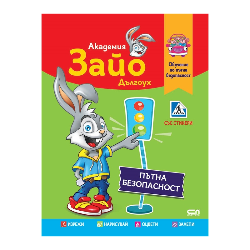 Зайо Дългоух те кани в своята академия, за да те запознае с основните правила за пътна безопасност. Неговите уроци са пълни с игри и забавления, така че неусетно ще се учиш, докато изрязваш, рисуваш, оцветяваш и лепиш стикери.Ето някои от нещата, които ще усвоиш при Зайо Дългоух:как да се държиш на пътя;какво не бива да правиш на пътя;за какво служи светофарът;кои са основните пътни знаци.И това не е всичко! В края на обучението вече ще бъдеш експерт по безопасността на пътя и ще получиш грамота. А после разходките ще са още по-приятни, защото ще умееш да се ориентираш и придвижваш навън, като следваш научените правила.Ако си готов, нека приключението да започне!