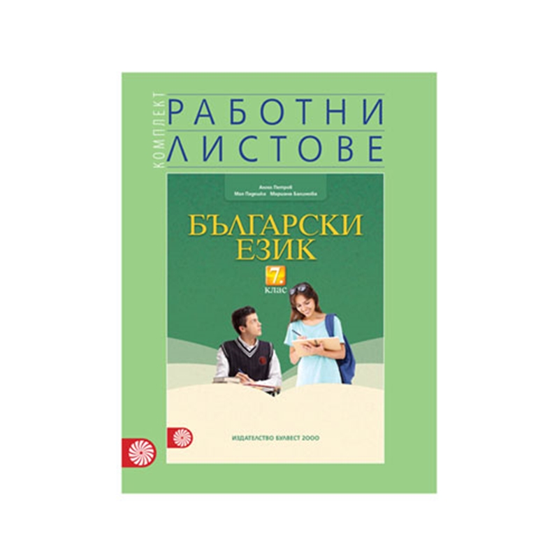 Учебният комплект работни листове по български език за 7. клас предлага:• интересни текстове; • разнообразни упражнения; • тестови задачи за проверка, оценка и самооценка на знанията и на уменията.Помагалото може да се използва както за работа в клас, така и за подготовка в домашни условия. Съдържа 24 работни листа – по един към всяка от темите в учебника по български език. Включени са разнообразни по съдържание и по изпълнение задачи, които обогатяват знанията за съвременния български книжовен език. При решаване на задачите за редактиране и за създаване на текстове се усъвършенстват уменията за общуване в различни речеви ситуации.В края на упражненията към всяка тема е предложен тест от осем задачи, с които се проверяват знанията и уменията.Ключът с верните отговори на тестовите задачи дава възможност учениците сами да направят оценка на собствените си постижения.Текстовете и упражненията към всяка от темите са разположени върху няколко листа, които при необходимост могат да бъдат отделяни от книжното тяло и да се съхраняват в ученическо портфолио.