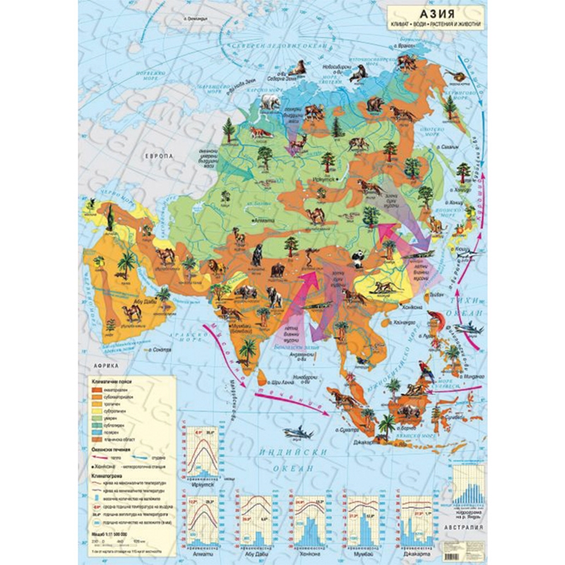 Стенна карта на Азия, климатична, 140 x 100 cm, ламинирана