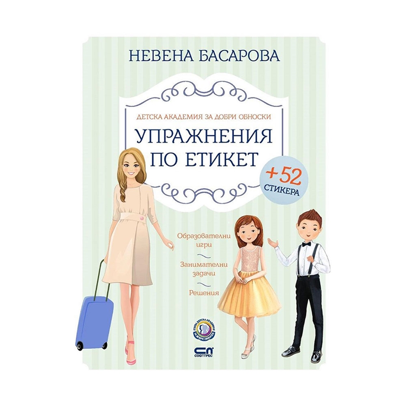 Светът на добрите обноски е по-забавен и цветен с „Упражнения по етикет“ – практичното помагало към бестселъра „Детска академия за добри обноски“!Логически задачи за възпитани умници, игрословици с учтиви думи, рицарски пъзели и лабиринти с правилата за общуване – експертът по добри обноски Невена Басарова събира куп образователни предизвикателства, които ще помогнат на всяко дете да затвърди и да упражни на практика най-важните правила за поведение.С помощта на цветните стикери и прекрасните илюстрации на Стелияна Донева всяко упражнение по етикет се превръща в истинско забавление!Невена Басарова-Дичева е основател и управител на Първа детска академия за добри обноски, сертифициран треньор по емоционална интелигентност, сертифициран експерт по социален етикет от престижната академия Minding Manners International в Лондон и създател на иновативната методика „Гъвкава дисциплина“.Освен посланик на добрите обноски, Невена е още TEDx лектор, автор на статии за престижни издания и предпочитан коментатор по проблемите на родителството, образованието и отглеждането на щастливи и успешни деца.Първата й авторска книга – „Детска академия за добри обноски“, е национален бестселър и многократно оглавява класациите по продажби на водещата книжарска верига у нас.„Упражнения по етикет“ е практично помагало, което може да се използва както самостоятелно, така и за затвърждаване на знанията от „Детска академия за добри обноски“.