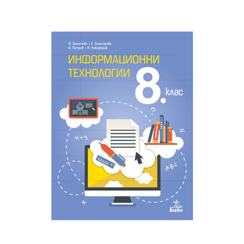 Учебник по информационни технологии за 8. клас с включен CD диск. Съдържа 88 страници с актуален учебен материал. Автори: Иванка Зангочева, Елена Димитрова, Владимир Петров, Явор Никифоров. Издателство: Анубис. Година на издаване: 2017. С меки корици.