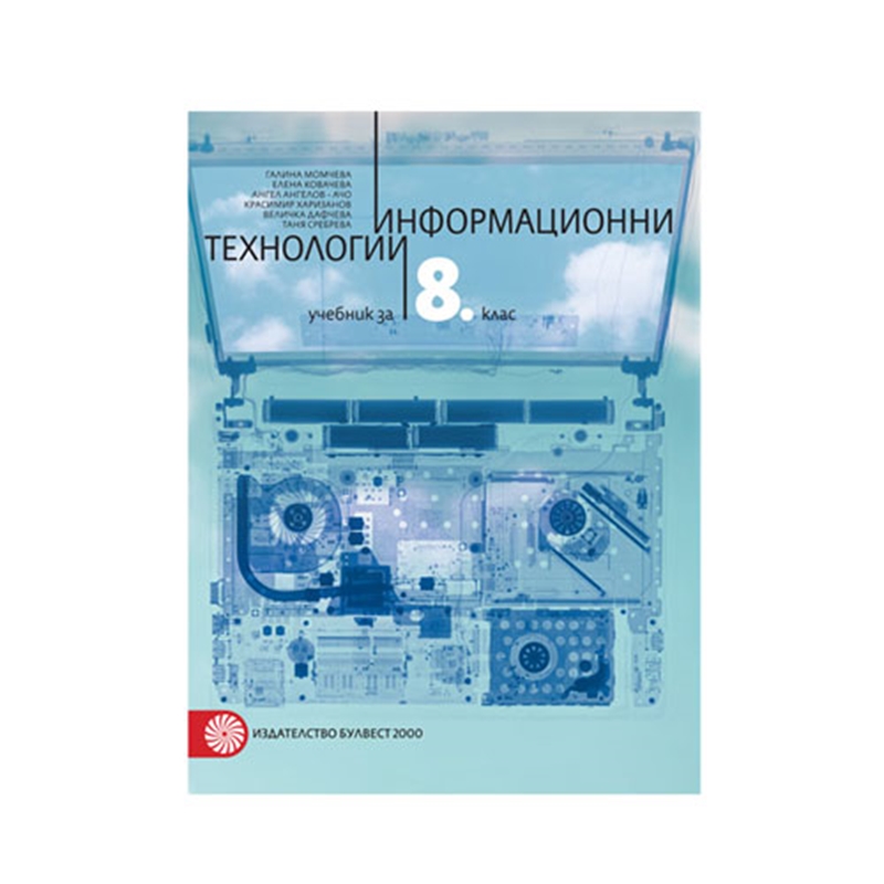 Учебник по информационни технологии за 8. клас. Съдържа 124 страници с актуален учебен материал. Автори: Галина Момчева-Гърдева, Елена Ковачева, Ангел Ангелов – Ачо, Красимир Харизанов, Величка Дафчева, Таня Сребрева. Издателство: Булвест 2000. Година на издаване: 2017. С меки корици.
