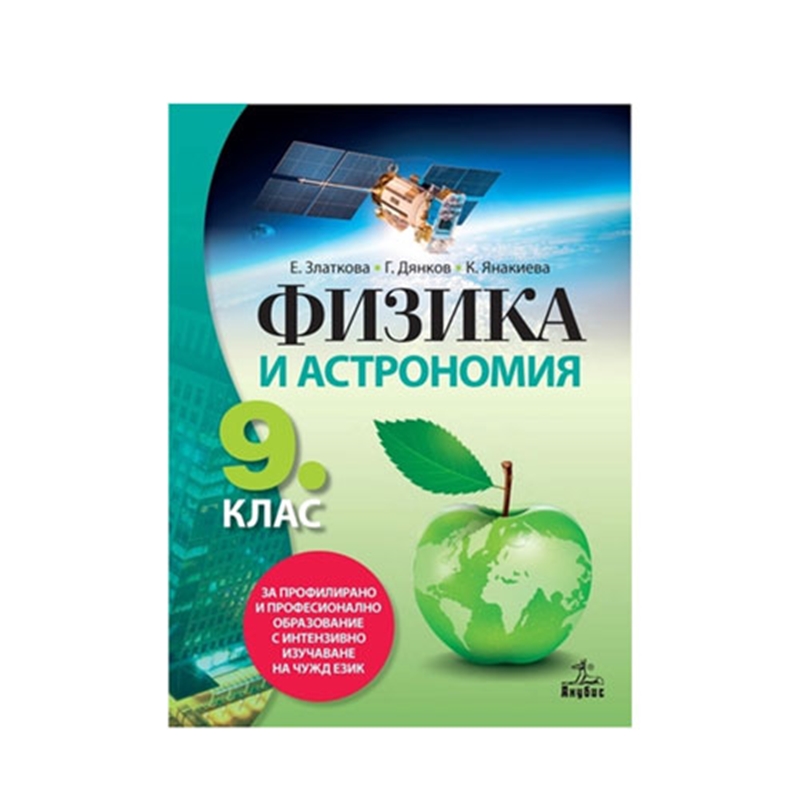 Учебник по физика и астрономия за 9. клас. Подходящ при профилирано и професионално образование с интензивно изучаване на чужд език. Съдържа 208 страници с актуален учебен материал. Автори: Елка Златкова, Георги Дянков, Каролина Янакиева. Издателство: Анубис. Година на издаване: 2018. С меки корици.