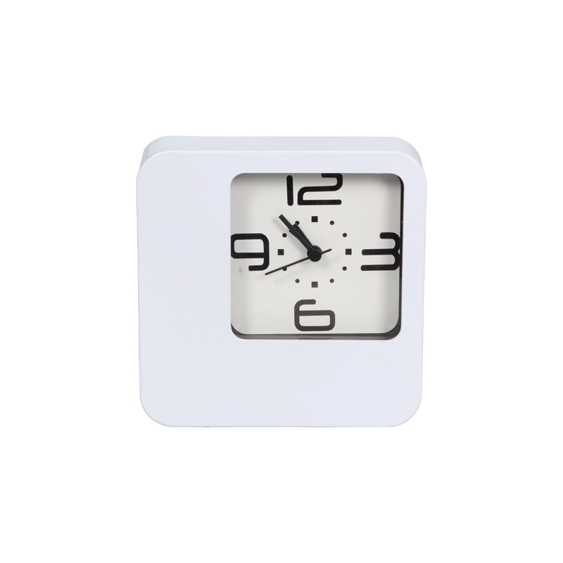 Настолен кварцов часовник с бял корпус. Работи с 1 АА батерия (не е включена в опаковката). Размери: 13.5 х 14 cm.