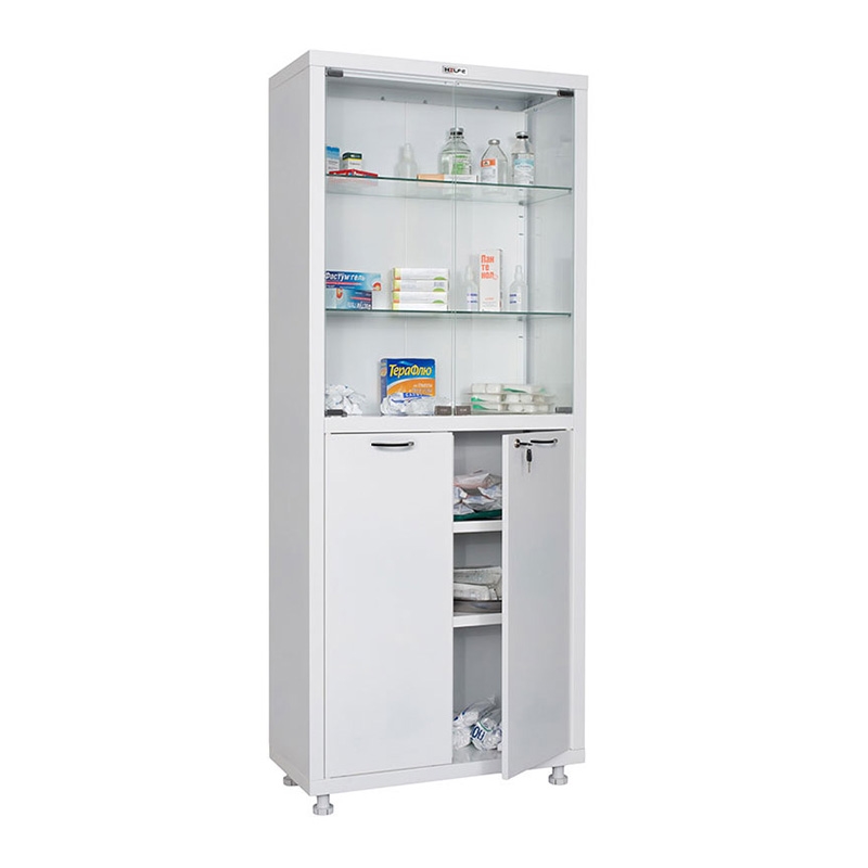 Шкафът е прадназначен за съхранение на медикаменти, болнични документи в медицински учреждения и организации. Изработен е от екологично чисти материали, не съдържа смоли и други органични съединения. Материал: стомана. Дебелина на страните: 0.6 mm. Дебелина на вратата: 0.7 mm Влагоустойчив и удобен за почистване. Заключване с ключ. 2 броя метални рафта. Максимално натоварване на метален рафт: 30 кг. 2 броя стъклени рафта. Максимално натоварване на стъклен рафт: 10 kg. Гаранционен срок: 2 години.