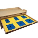 Продуктът представлява дървен скрин/шкаф с размери 50 х 31 х 25 cm. В скрина има 6 чекмеджета с отвор в средата, който позволява лесно и удобно изваждане на всяко от тях. След като се извади, всяко чекмедже може да служи като поднос, за да може децата лесно да занесат желаните материали до мястото си за игра. Във всяко чекмедже има по шест жълти квадрата, като във всеки квадрат има изрязан отвор с различна геометрична форма, в който се слага съответната геометрична форма. Целта на заниманието със скрина е децата да се запознаят с разнообразието на основните геометрични форми и да се научат да правят разлика между тях. Освен това заниманията с плочките развиват моториката на пръстите, усъвършенстват зрителното възприятие, провокират наблюдателност и интерес към заобикалящия ни растителен и животински свят. Размери: 50 х 31 х 25 cm, тегло: 10 kg. Подходящо за деца над 4 години.