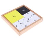 Продуктът представлява дървен скрин/шкаф с размери 50 х 31 х 25 cm. В скрина има 6 чекмеджета с отвор в средата, който позволява лесно и удобно изваждане на всяко от тях. След като се извади, всяко чекмедже може да служи като поднос, за да може децата лесно да занесат желаните материали до мястото си за игра. Във всяко чекмедже има по шест жълти квадрата, като във всеки квадрат има изрязан отвор с различна геометрична форма, в който се слага съответната геометрична форма. Целта на заниманието със скрина е децата да се запознаят с разнообразието на основните геометрични форми и да се научат да правят разлика между тях. Освен това заниманията с плочките развиват моториката на пръстите, усъвършенстват зрителното възприятие, провокират наблюдателност и интерес към заобикалящия ни растителен и животински свят. Размери: 50 х 31 х 25 cm, тегло: 10 kg. Подходящо за деца над 4 години.