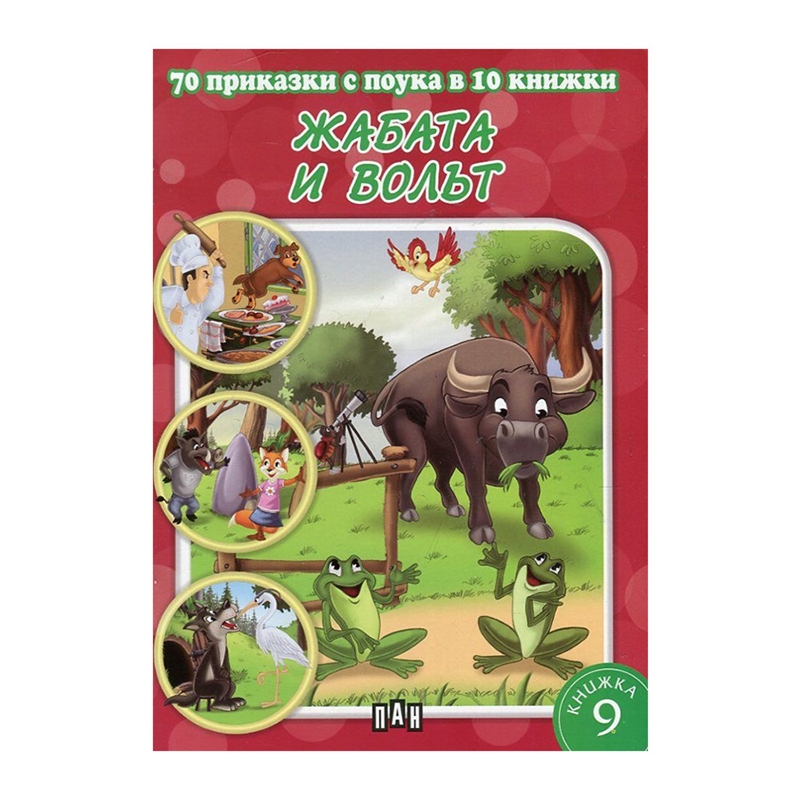 Красиво илюстрираната детска книжка „Жабата и волът“ от поредицата „70 приказки с поука в 10 книжки“ на издателство „Пан“ ще зарадва всеки малък любознайко и ще направи четенето още по-приятно. Всяка книжка от поредицата „70 приказки с поука в 10 книжки“ съдържа седем кратки приказки, завършващи с поука. Предназначени са за малки, любознателни деца, независимо дали вече знаят да четат. Когато прочете всичките десет книжки от поредицата, детето ще запомни мъдростта на тези интересни седемдесет приказки.
