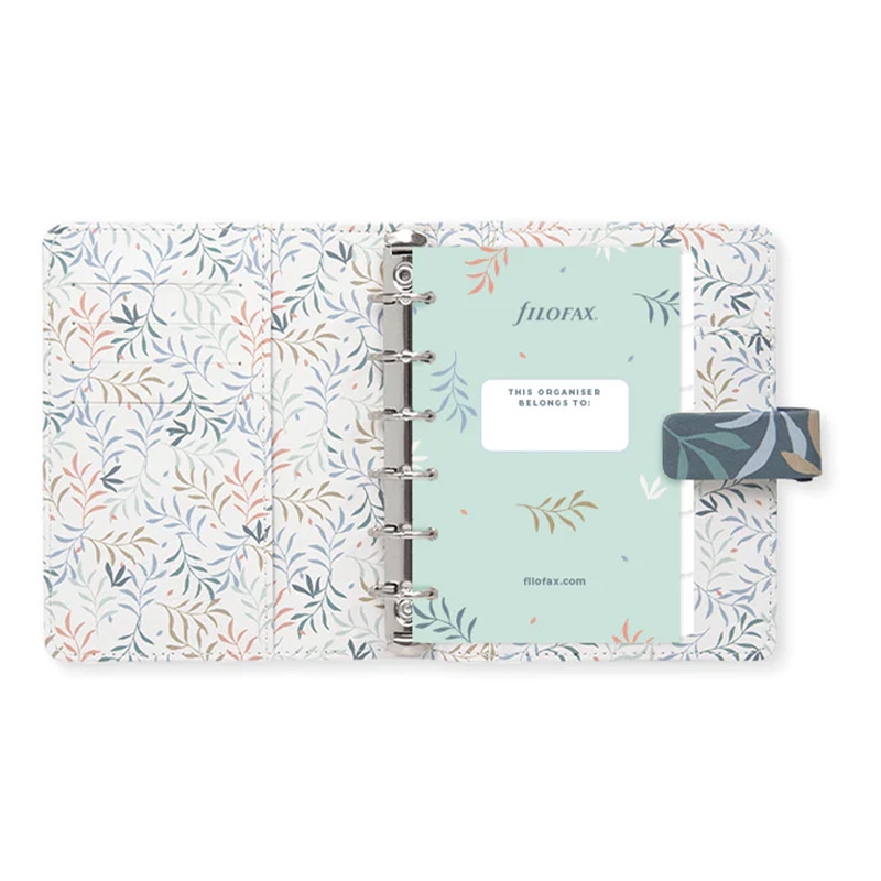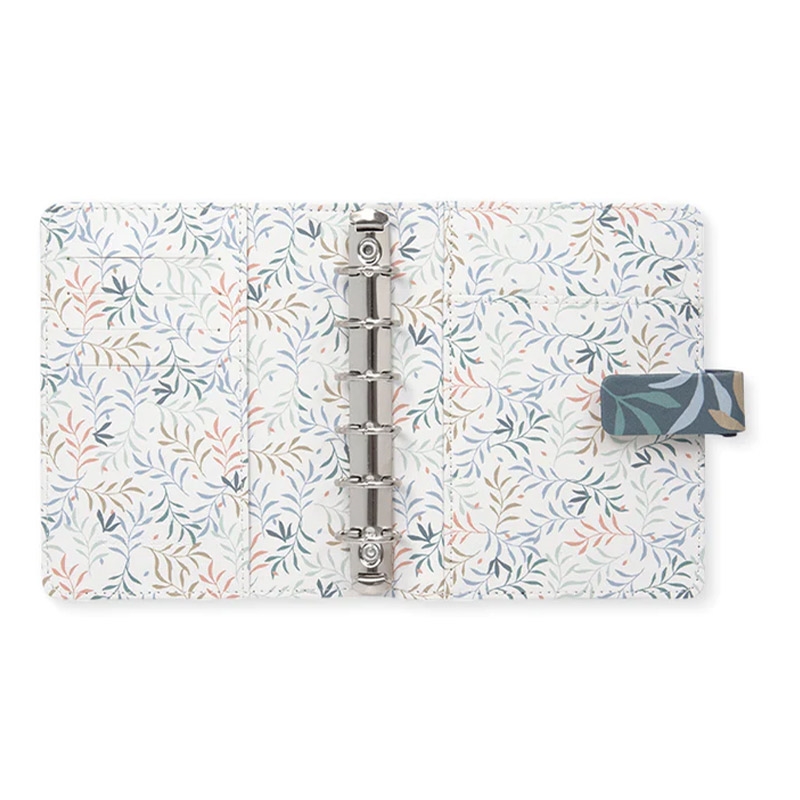 Организирайте ежедневието си с цветната колекция органайзери Botanical с растителни мотиви! Те съчетават традиционния стил на марката със съвременен и функционален дизайн. Органайзерът е изработен от висококачествена синтетична кожа в син цвят. Вътрешната страна на лявата корица разполага с четири джоба за карти и един джоб за документи. Вътрешната страна на дясната корица разполага с джоб за бележник и еластичен държач за химикалка. Метална шина с шест ринга и повдигащ (отварящ) механизъм, 30 mm в диаметър. Размери: Pocket, 14.6 х 12.8 х 3.6 cm. Миксирайте и променяйте съдържанието на всички органайзери Filofax с разнообразието от аксесоари. Подредете ежедневието си изцяло по ваш вкус! Пълнеж на органайзера: Предпазна страница; Преден лист; Рекламна страница; Рекламна страница на Filofax App; Годишен планер без дати; 6 разделителя; 8 листа с точки; 8 нелинирани листа; 8 линирани листа; 8 листа за задачи; 8 листа с контакти; 8 сини линирани листа; 8 зелени линирани листа; 8 розови линирани листа; Прозрачен лист / лист с индекс; Джоб с горно отваряне.
