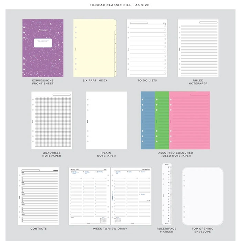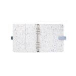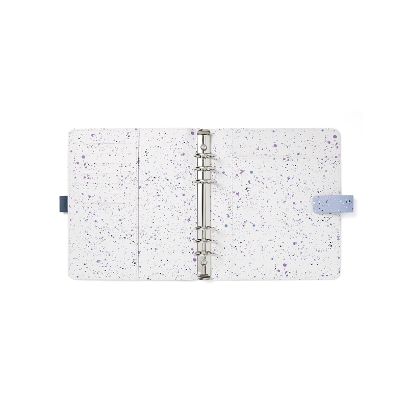 Организирайте ежедневието си с цветната колекция органайзери Expressions в пастелни цветове! Те съчетават традиционния стил на марката със съвременен и функционален дизайн и се отличават със затварянето им с ластик. Органайзерът е изработен от висококачествена синтетична кожа в светлосин цвят. Вътрешната страна на лявата корица разполага със седем джоба за карти, джоб за доку,менти и елстичен държач за химикалка. Вътрешната страна на дясната корица разполага с джоб за документи, джоб за бележник и еластичен държач за химикалка. Метална шина с шест ринга и повдигащ (отварящ) механизъм, 30 mm в диаметър. Размери: A5, 23.3 х 22 х 4.2 cm. 134 листа. Миксирайте и променяйте съдържанието на всички органайзери Filofax с разнообразието от аксесоари. Подредете ежедневието си изцяло по ваш вкус! Пълнеж на органайзера: Предпазна страница; Преден лист; Рекламна страница; Рекламна страница на Filofax App; Годишен планер без дати; 6 разделителя; 8 листа с точки; 8 нелинирани листа; 8 линирани листа; 8 листа за задачи; 8 листа с контакти; 8 сини линирани листа; 8 зелени линирани листа; 8 розови линирани листа; Прозрачен лист / лист с индекс; Джоб с горно отваряне. Календар: от 26 декември 2023 г. до 7 януари 2025 г.