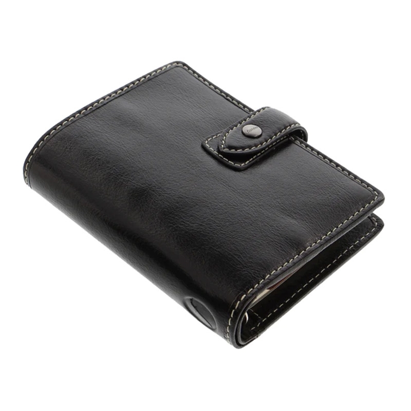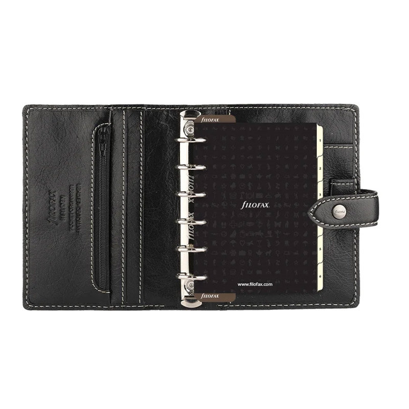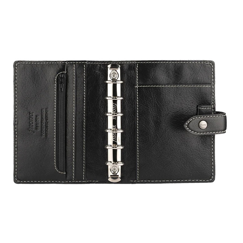 Организирайте ежедневието си с колекцията кожени органайзери Malden на Filofax! Те съчетават традиционния стил на марката със съвременен и функционален дизайн. Органайзерът е изработен от висококачествена кожа в черен цвят. Вътрешната страна на лявата корица разполага с три вертикални джоба, един вертикален джоб с цип. Вътрешната страна на дясната корица разполага с един вертикален джоб, един джоб за бележник и кожен държач за химикалка. Метална шина с шест ринга и повдигащ (отварящ) механизъм, 30 mm в диаметър. Размери: 14.8 х 12.8 х 4 cm. Миксирайте и променяйте съдържанието на всички органайзери Filofax с разнообразието от аксесоари. Подредете ежедневието си изцяло по ваш вкус! Пълнеж на органайзера: Предпазна страница; Преден лист; Рекламна страница; Рекламна страница на Filofax App; Годишен планер без дати; 6 разделителя; 8 листа с точки; 8 нелинирани листа; 8 линирани листа; 8 листа за задачи; 8 листа с контакти; 8 сини линирани листа; 8 зелени линирани листа; 8 розови линирани листа; Кафяв линиран лист / лист с индекс; Джоб с горно отваряне.