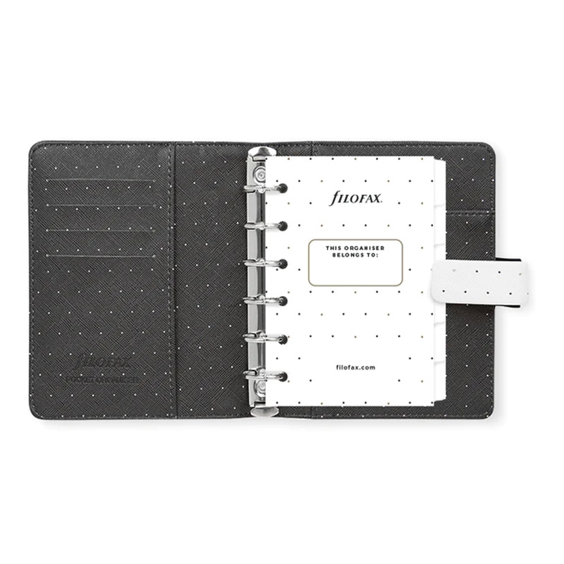 Организирайте ежедневието си с цветната колекция органайзери Moonlight на Filofax! Те съчетават традиционния стил на марката със съвременен и функционален дизайн. Органайзерът е изработен от висококачествена синтетична кожа в бял цвят. Вътрешната страна на лявата корица разполага с четири джоба за карти и един вертикален джоб. Вътрешната страна на дясната корица разполага с един джоб за бележник и еластичен държач за химикалка. Метална шина с шест ринга и повдигащ (отварящ) механизъм, 30 mm в диаметър. Размери: 14.6 х 12.8 х 3.6 cm. Миксирайте и променяйте съдържанието на всички органайзери Filofax с разнообразието от аксесоари. Подредете ежедневието си изцяло по ваш вкус! Пълнеж на органайзера: Предпазна страница; Преден лист; Рекламна страница; Рекламна страница на Filofax App; Годишен планер без дати; 6 разделителя; 8 листа с точки; 8 нелинирани листа; 8 линирани листа; 8 листа за задачи; 8 листа с контакти; 8 сини линирани листа; 8 зелени линирани листа; 8 розови линирани листа; Прозрачен лист / лист с индекс; Джоб с горно отваряне.