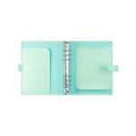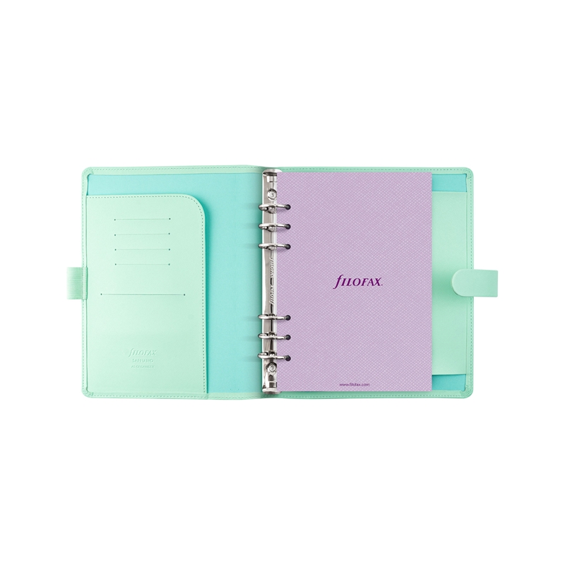Организирайте ежедневието си с цветната колекция органайзери Saffiano! Те съчетават традиционния стил на марката със съвременен и функционален дизайн. Органайзерът е изработен от висококачествена синтетична кожа в цвят мента. Вътрешната страна на лявата корица разполага с пет джоба за карти, един джоб за документи и еластичен държач за писалка. Вътрешната страна на дясната корица разполага с джоб за бележник. Метална шина с шест ринга и повдигащ (отварящ) механизъм, 30 mm в диаметър. Размери: A5, 23.6 х 21 х 4.4 cm. 134 листа. Миксирайте и променяйте съдържанието на всички органайзери Filofax с разнообразието от аксесоари. Подредете ежедневието си изцяло по ваш вкус! Пълнеж на органайзера: Предпазна страница; 6 разделителя; 4 листа за задачи; 8 линирани листа; 4 листа на квадратчета; 8 нелинирани листа; 24 цветни линирани листа; 8 листа за контакти; Седмичен дневник, разграфен на 2 страници; Линия; Прозрачен джоб с горно отваряне. Календар: от 26 декември 2022 г. до 3 януари 2024 г.