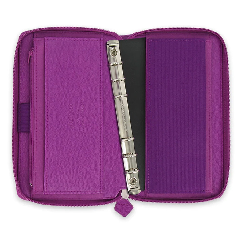 Организирайте ежедневието си с цветната колекция органайзери Saffiano на Filofax! Те съчетават традиционния стил на марката със съвременен и функционален дизайн. Органайзерът е с цип, а също разполага и с подвижен механизъм и функционалност за чанта/портфейл. Изработен от висококачествена синтетична кожа в лилав цвят. Вътрешната страна на лявата корица разполага с шест джоба за карти, три вертикални джоба, един джоб с цип и еластичен държач за химикалка. Вътрешната страна на дясната корица разполага дванадесет джоба за карти, един многофункционален еластичен джоб и два вертикални джоба. Метална шина с шест ринга и повдигащ (отварящ) механизъм, 30 mm в диаметър. Размери: 20.8 х 12.5 х 3.1 cm. Миксирайте и променяйте съдържанието на всички органайзери Filofax с разнообразието от аксесоари. Подредете ежедневието си изцяло по ваш вкус! Пълнеж на органайзера: Предпазна страница; Преден лист; Рекламна страница; Рекламна страница на Filofax App; Годишен планер без дати; 6 разделителя; 8 листа с точки; 8 нелинирани листа; 8 линирани листа; 8 листа за задачи; 8 листа с контакти; 8 сини линирани листа; 8 зелени линирани листа; 8 розови линирани листа; Прозрачен лист / лист с индекс; Джоб с горно отваряне; Пад с листа на точки (20 листа).