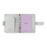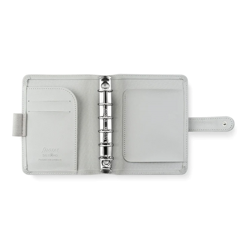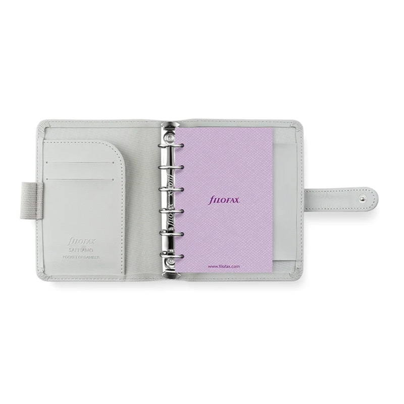 Организирайте ежедневието си с цветната колекция органайзери Saffiano на Filofax! Те съчетават традиционния стил на марката със съвременен и функционален дизайн. Органайзерът е изработен от висококачествена синтетична кожа в цвят гранит. Вътрешната страна на лявата корица разполага с два джоба за карти, един секретарски джоб и еластичен държач за химикалка. Вътрешната страна на дясната корица разполага с един джоб за бележник. Метална шина с шест ринга и повдигащ (отварящ) механизъм, 30 mm в диаметър. Размери: 14.5 х 12.7 х 3.7 cm. Миксирайте и променяйте съдържанието на всички органайзери Filofax с разнообразието от аксесоари. Подредете ежедневието си изцяло по ваш вкус! Пълнеж на органайзера: Предпазна страница; Преден лист; Рекламна страница; Рекламна страница на Filofax App; Годишен планер без дати; 6 разделителя; 8 листа с точки; 8 нелинирани листа; 8 линирани листа; 8 листа за задачи; 8 листа с контакти; 8 сини линирани листа; 8 зелени линирани листа; 8 розови линирани листа; Прозрачен лист / лист с индекс; Джоб с горно отваряне.