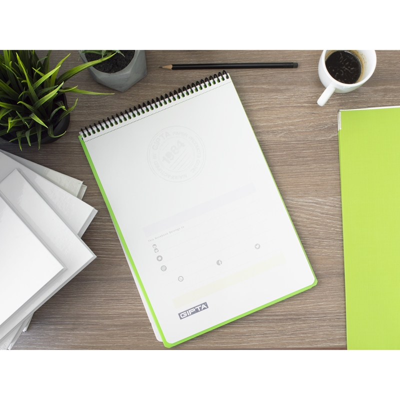 Произведен от висококачествена бяла офсетова хартия. Микроперфорация за лесно откъсване на листовете. 500 микрона PP корица. Пластмасова спирала.При поръчка получавате някой от показаните цветове на случаен принцип.